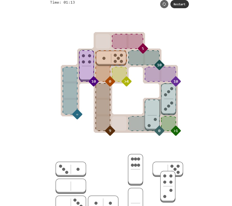 If you're having trouble, try filling in the easier matches after working backward from the more stringent rules, such as target sums or greater/less than spots. As part of the process, don't be scared to rearrange the pieces.
