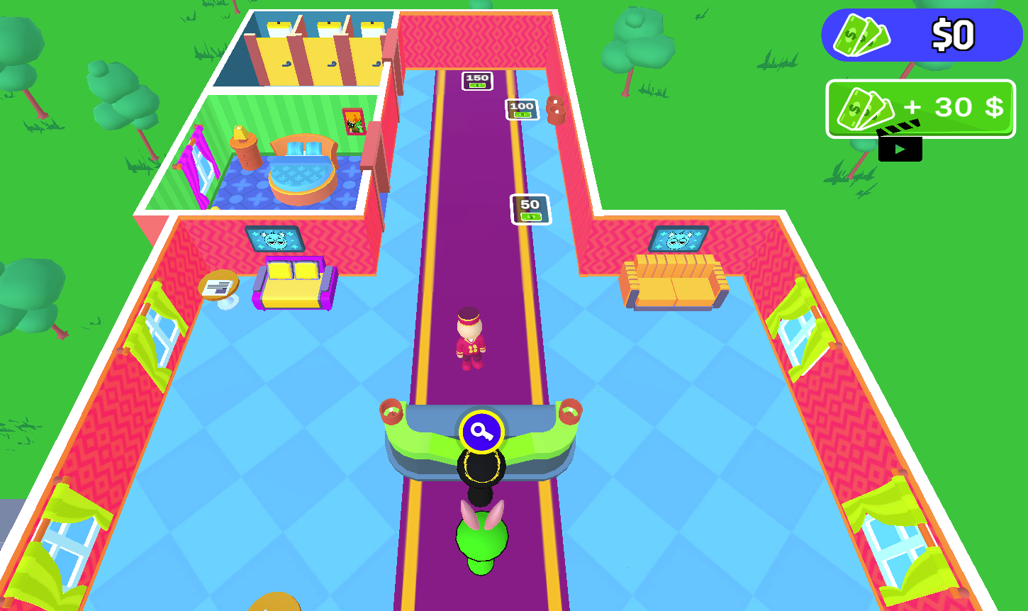 As you earn coins from managing guest needs, you can use them to unlock new parts of the hotel. To do this, move your character over colored tiles that indicate a new room or upgrade is available. These might include new guest rooms, better furnishings, or quicker cleaning equipment. Every upgrade boosts your hotel's productivity and allows you to accommodate more guests at once.